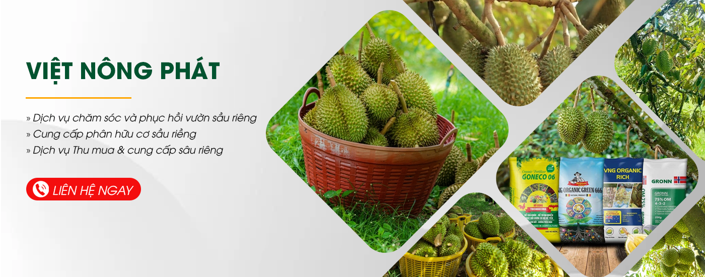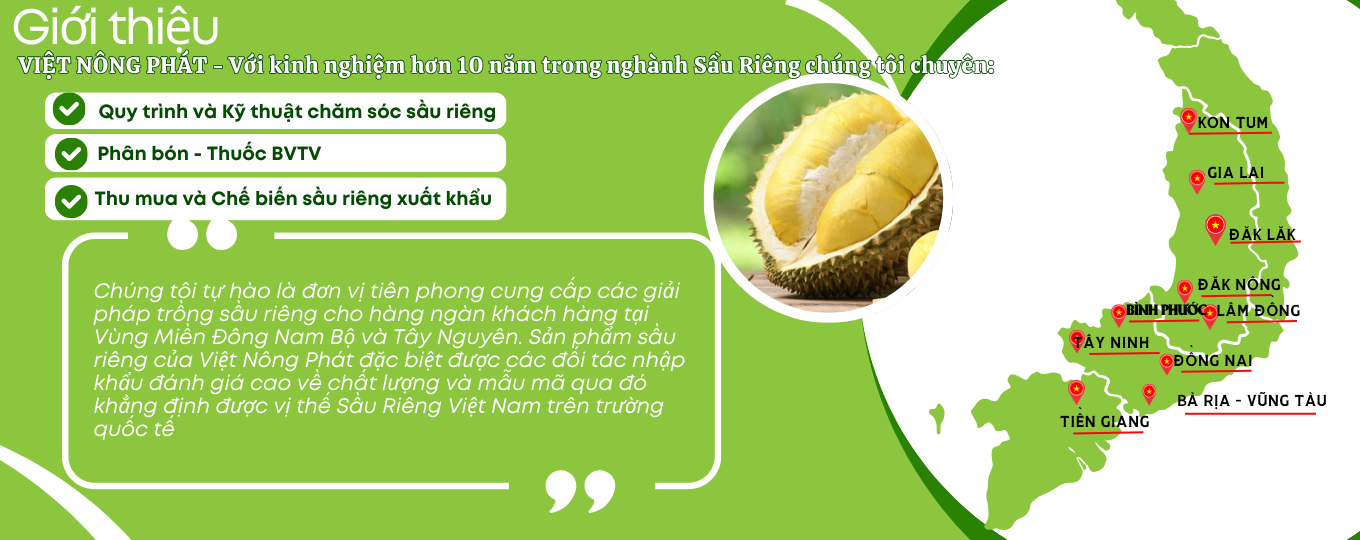 Công Ty TNHH Nông Nghiệp Việt Nông Phát là đơn vị chuyên nghiệp trong lĩnh vực cung cấp giải pháp, quy trình chăm sóc và dinh dưỡng cho các giai đoạn của cây Sầu Riêng.